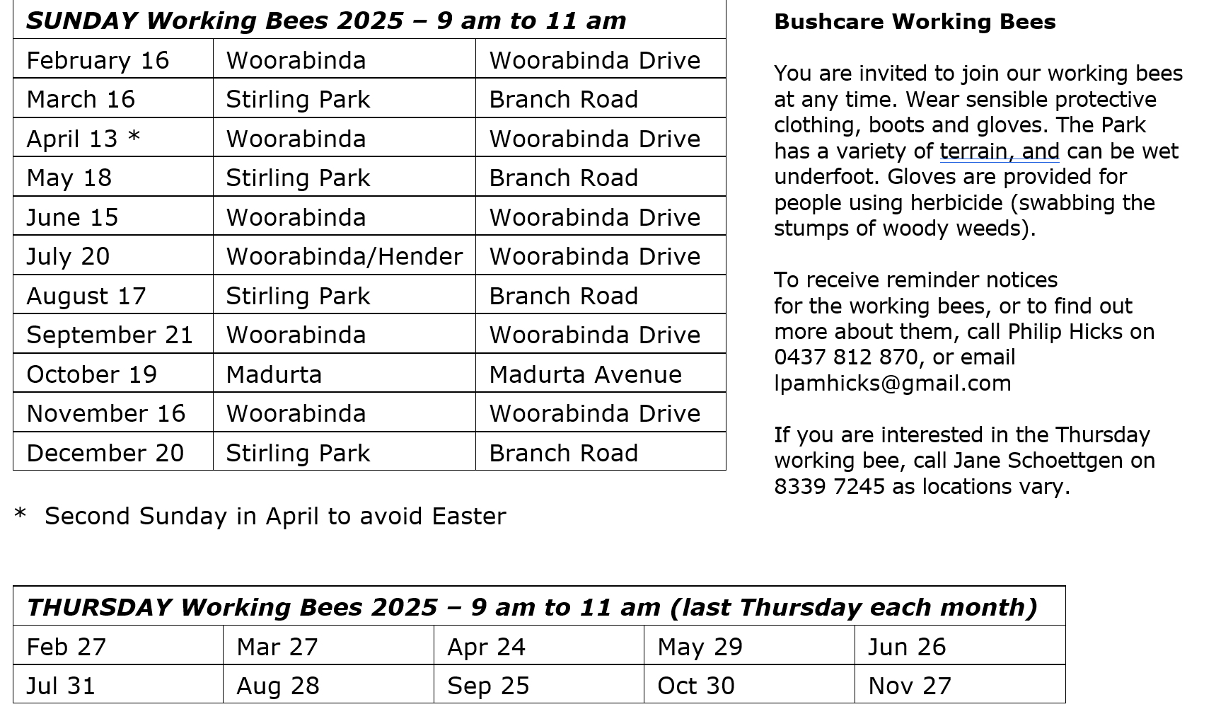 To receive reminder notices for the working bees, or to find out more about them, call Philip on 0437 812 870.